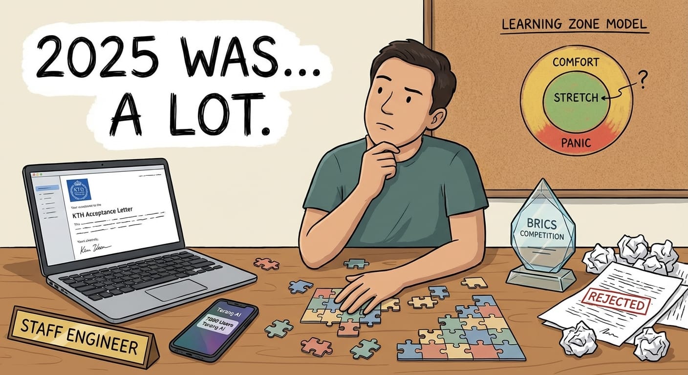 I got accepted to KTH. Terang AI grew to 7000 users and 3 B2B clients. I became a Staff Engineer at a YC company. We won an award at a BRICS competition. I mass-applied to countless things and got rejected by most of them.