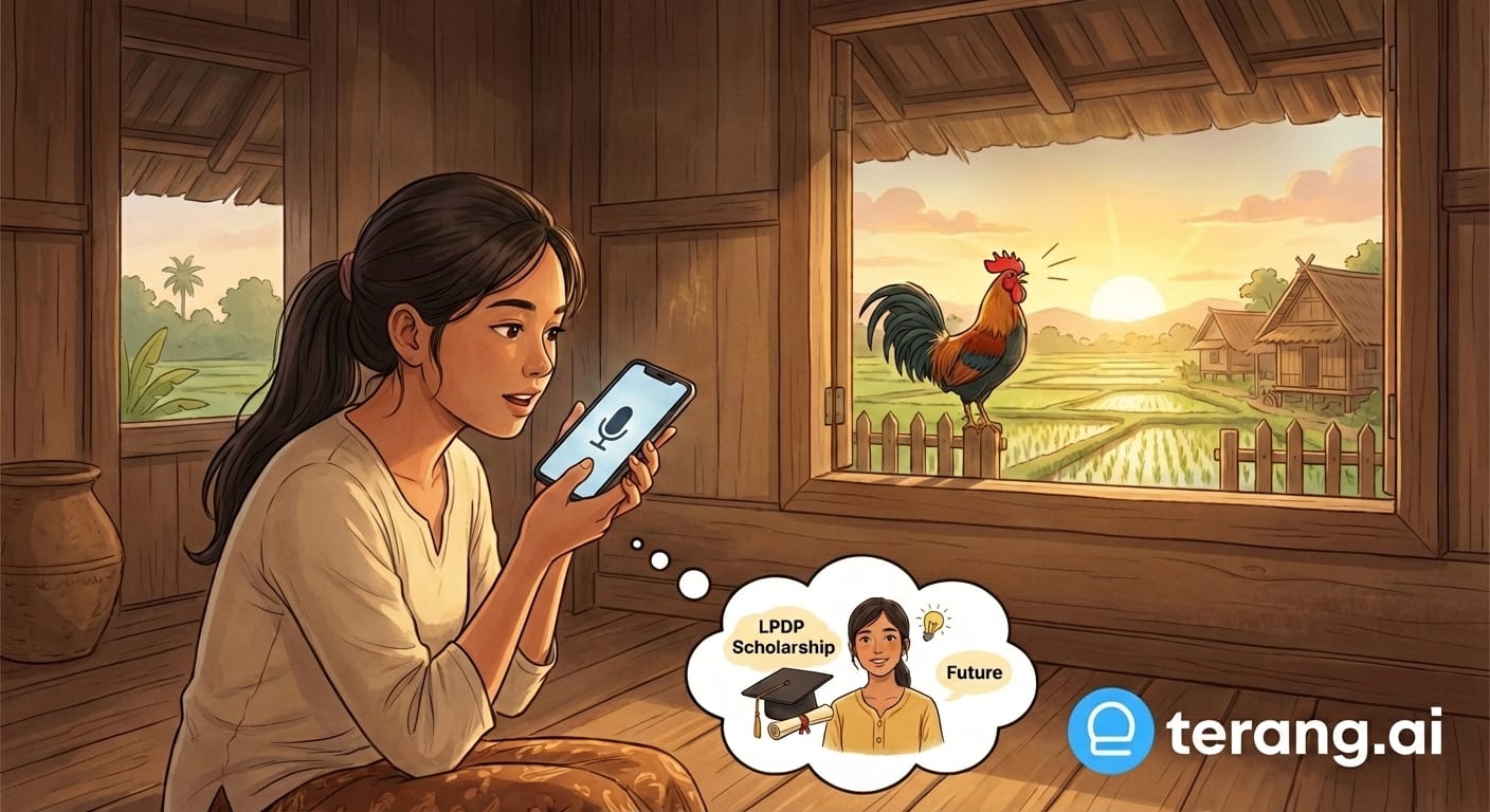 Then I heard it. A rooster crowing in the background. The sound of a village morning. And a voice, practicing for an LPDP scholarship interview, using Terang AI to prepare.